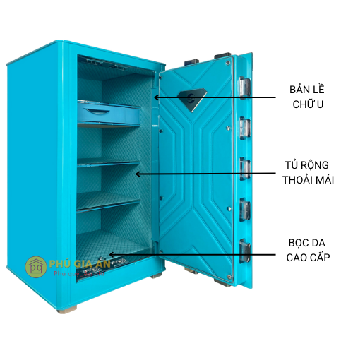 Bên trong két là một không gian sang trọng với lớp da dập nổi cao cấp bao phủ toàn bộ, giúp bảo vệ trang sức, đồng hồ hay giấy tờ quan trọng khỏi trầy xước và ẩm mốc. Các ngăn kéo được bố trí khoa học, tinh tế. Đặc biệt, sản phẩm còn tích hợp hộp xoay đồng hồ cơ, một tính năng chỉ thấy trên các dòng két sắt thượng lưu.