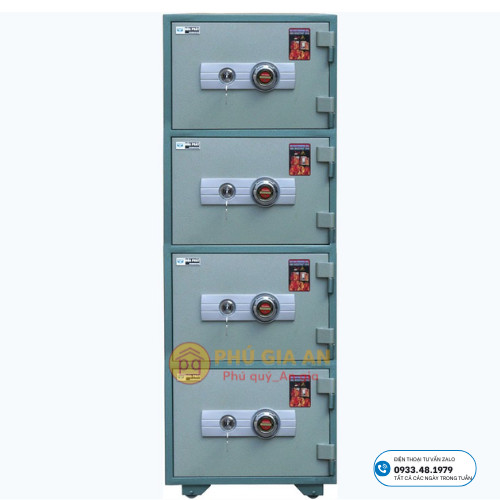 – Két sắt dáng đứng, mỗi cửa có một khóa chìa, một bộ khoá đổi mã – có thể đổi mã tùy thích.