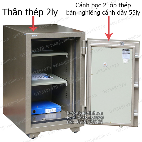 • Két có vỏ thép toàn thân dày 2mm, cánh cửa được bọc 2 lớp thép kết hợp với công nghệ gấp .Bản nghiêng cánh cửa dày tới 55mm, tăng cường khả năng chống cạy két, vượt trội hơn các két sắt thông thường (thường có vỏ thép từ 0,6-1mm, bản cánh chỉ từ 15-30mm).