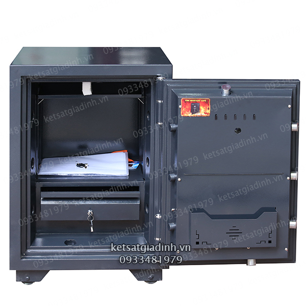 • Thiết kế thông minh: Tối ưu hóa diện tích trong lòng két, có 1 đợt chia ngăn để sắp xếp giấy tờ một cách khoa học, 1 ngăn kéo phụ để chứa các đồ vật nhỏ và 1 ngăn hầm bí mật dưới đáy két để cất giữ các đồ vật giá trị như vàng bạc, trang sức.