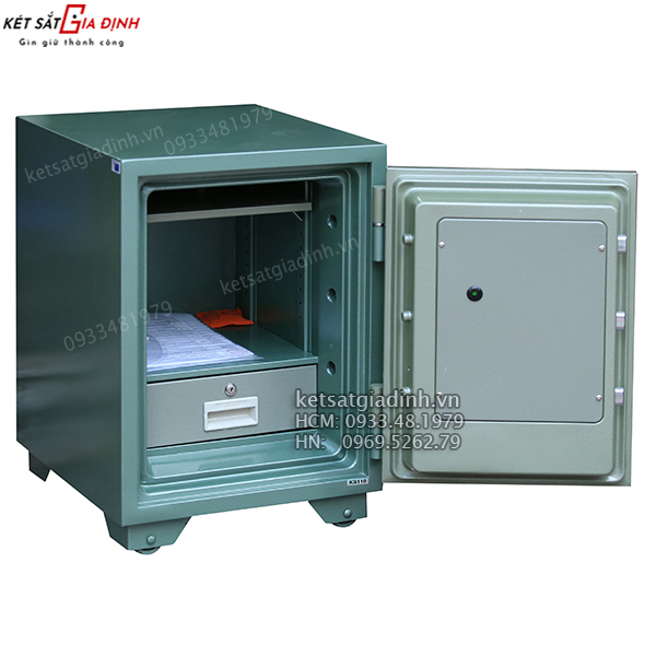• Nội thất bên trong két có 1 đợt chia ngăn di động có thể thay đổi lên xuống và 1 hộc ngăn kéo có khóa chìa.