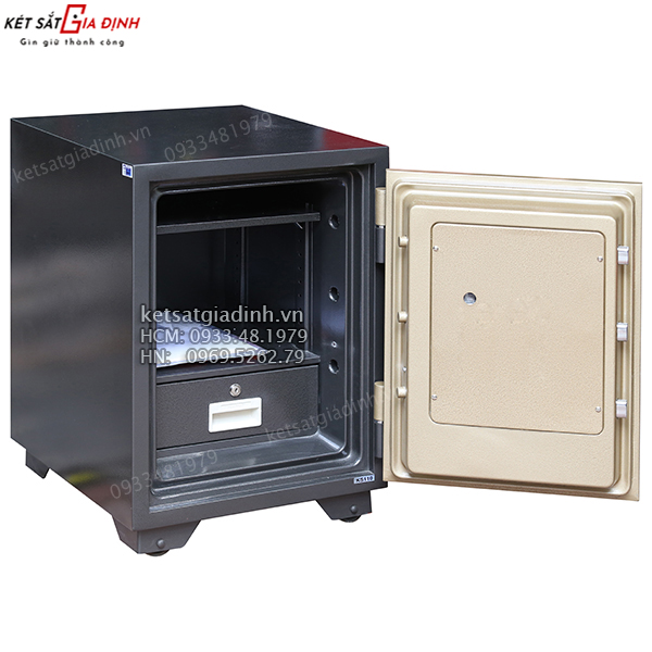 Két được làm từ thép không gỉ hai lớp (dày 0.8 – 1.2mm), bên trong thân và cánh cửa được đổ đặc bằng bê tông xốp cách nhiệt, giúp tăng cường khả năng chống cháy.