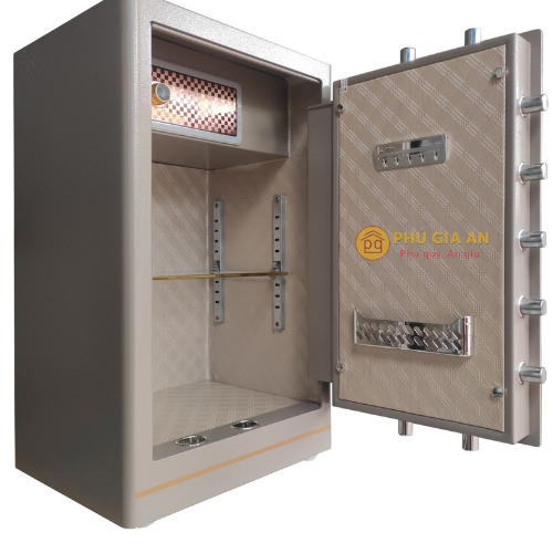 Không gian bên trong két sắt Bofa ZB-80DJ được chăm chút tỉ mỉ với lớp da cao cấp màu vàng ánh, bao phủ xung quanh và các vách ngăn. Thiết kế này vừa bảo vệ tài sản, trang sức khỏi trầy xước, vừa tạo nên vẻ đẹp đẳng cấp cho sản phẩm.