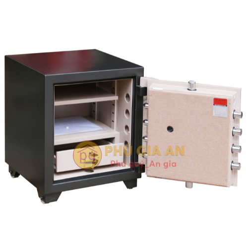 • Thân két được chế tạo từ hai lớp thép mạ điện GA, kết hợp với đá, thép hạt và vật liệu cách nhiệt có khả năng chịu nhiệt cao, đồng thời đảm bảo tính chống đục phá vượt trội.