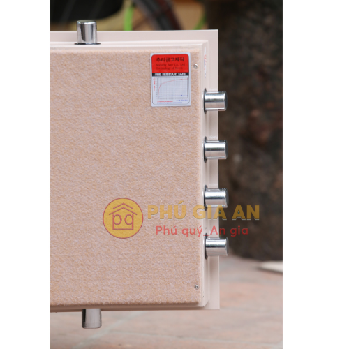 • Hệ thống chốt an toàn gồm 10 chốt Inox phi 32mm cắm sâu vào thân két theo 4 chiều, tạo sự kiên cố, chống cạy phá tối đa.