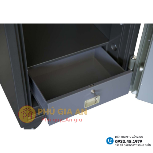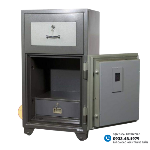 Két được thiết kết ngăn kéo trên có khóa chìa + tay nắm khi mở ra, khi để đồ vào ( tiền hoặc giấy tờ), khi đóng lại, đồ tự động rơi – thả xuống khoang chứa phía dưới có khóa chìa + khóa mã an toàn.
