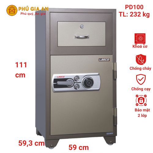 Két sắt LEECO PD100(M) được nhập khẩu nguyên chiếc từ Thái Lan, là lựa chọn lý tưởng cho doanh nghiệp, cửa hàng, tiệm vàng và ngân hàng cần bảo vệ tài sản một cách an toàn. Với thiết kế thông minh giúp thả tiền nhanh chóng mà không cần mở két, kết hợp tính năng chống cháy, chống nước và chống trộm, sản phẩm mang đến sự an tâm tuyệt đối.
