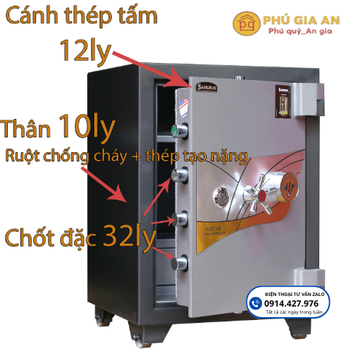 – Thân vỏ thép Cacbon đặc nguyên tấm dày 10ly chống phá, đây là điểm khác biệt rất lớn với những mẫu két thường thân vỏ dày 0.8ly-2ly (dòng này mặt lưng két sẽ đượt giật cấp lõm vào do phải ghép từ tấm thép mỏng).
