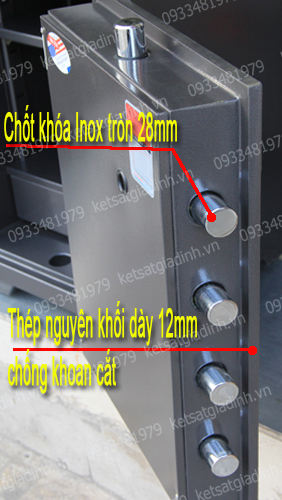 • Hệ thống chốt inox phi 32mm gồm 10 chốt xuyên sâu vào thân két theo 4 chiều, đảm bảo an toàn cao khi cửa đóng.