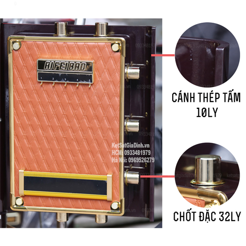 • Cửa két làm từ thép Carbon dày 10mm, trang bị bản lề chìm trục inox kết hợp với hai chốt khóa mạ vàng phi 30mm, vừa tăng tính thẩm mỹ vừa chống cắt phá.
