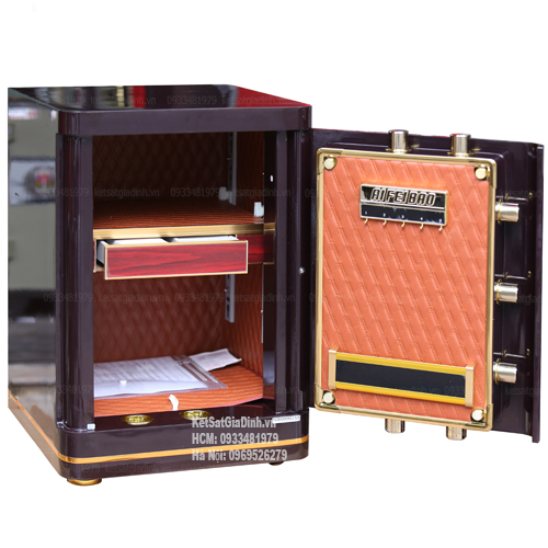 • Hệ thống ngăn: 2 ngăn lớn, rộng rãi để lưu trữ giấy tờ, tiền mặt và tài sản có giá trị. Hộc kéo bọc nhung chuyên dụng cho trang sức.