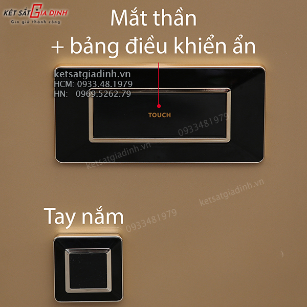Màn hình cảm ứng và camera nhận diện khuôn mặt hiện đại Hệ thống chốt khóa inox đặc chống cắt phá an toàn Khoang chứa rộng rãi đựng vừa giấy tờ A4 và laptop Ngăn hầm bí mật dưới đáy két sắt giúp cất giấu tài sản an toàn