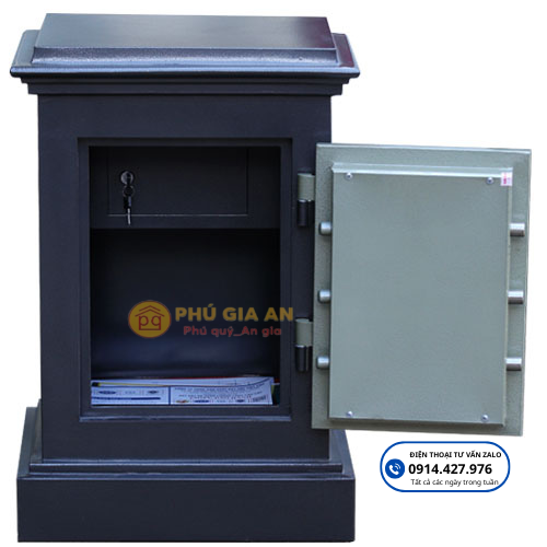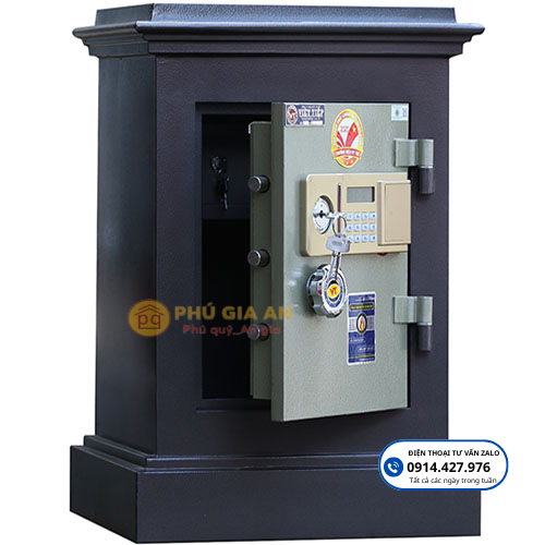 Nội thất bên trong được bố trí khoa học với một ngăn phụ có khóa riêng biệt, giúp gia chủ dễ dàng phân loại tài sản quý giá như trang sức hay tiền mặt. Cánh cửa két cũng được đổ ruột chống cháy kiên cố, kết hợp với hệ thống chốt khóa làm từ thép đặc ăn sâu vào lòng két, thách thức mọi nỗ lực cạy phá.
