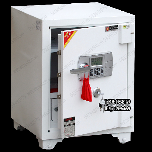 • Mở két: Cắm khóa chìa, xoay phải + mở mã điện tử + nhấc tay nắm mở két.