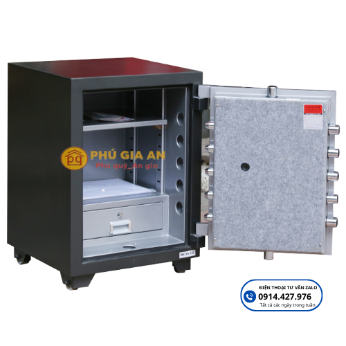 + Hệ thống chốt Inox liên hoàn xuyên sâu vào thân két khi đóng cửa – với 12 chốt Inox phi 32mm nhao 4 chiều vô cùng chắc chắn khi cửa đóng.