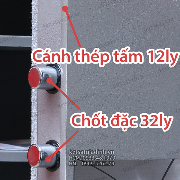 - Hệ thống chốt an toàn gồm 10 chốt Inox phi 32mm cắm sâu vào thân két theo 4 chiều, tạo sự kiên cố, chống cạy phá tối đa.