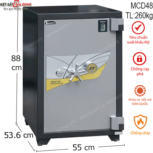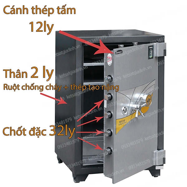 - Thân két được chế tạo từ hai lớp thép mạ điện GA, kết hợp với đá, thép hạt và vật liệu cách nhiệt có khả năng chịu nhiệt cao, đồng thời đảm bảo tính chống đục phá vượt trội.